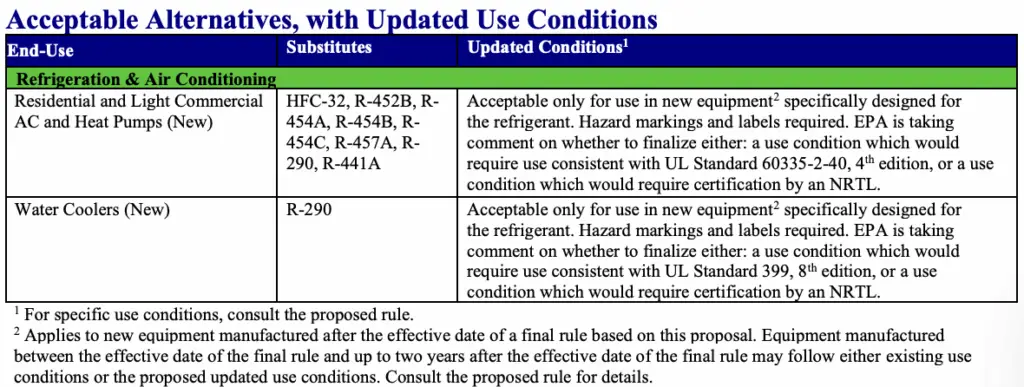 - Update use conditions for multiple refrigerants (i.e., R-290 (propane) in water coolers and for eight refrigerants in residential and light commercial AC and heat pump applications)