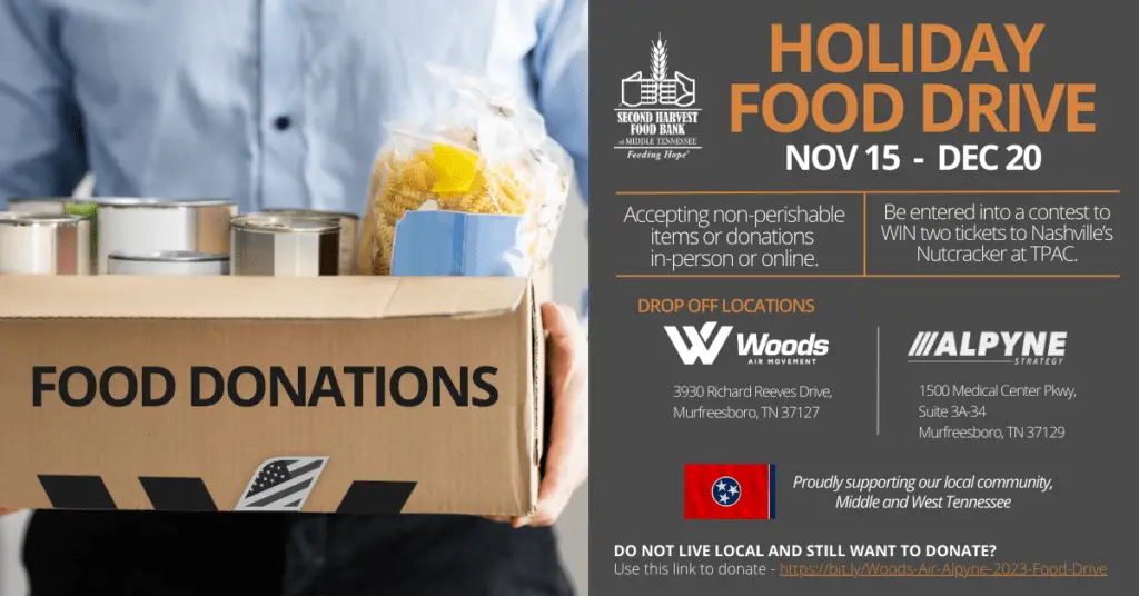 Murfreesboro, TN, November 16, 2023 — Woods Air Movement US and Alpyne Strategy of Murfreesboro, TN, are holding a holiday food drive for Second Harvest Food Bank of Middle Tennessee. The drive will occur from Nov. 15 to Dec. 20, 2023.